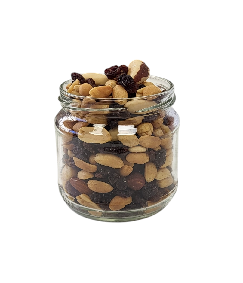 Olajos magvak és több fajta mazsola keveréke. Összetevők: Csemege és barna mazsolák, sótlan pörkölt földimogyoró, mandula, törökmogyoró, kesudió, paradió. Felhasználási ötletek: Elsősorban nassolásra használjuk, de tehetjük müzlibe, joghurtba, salátába is.