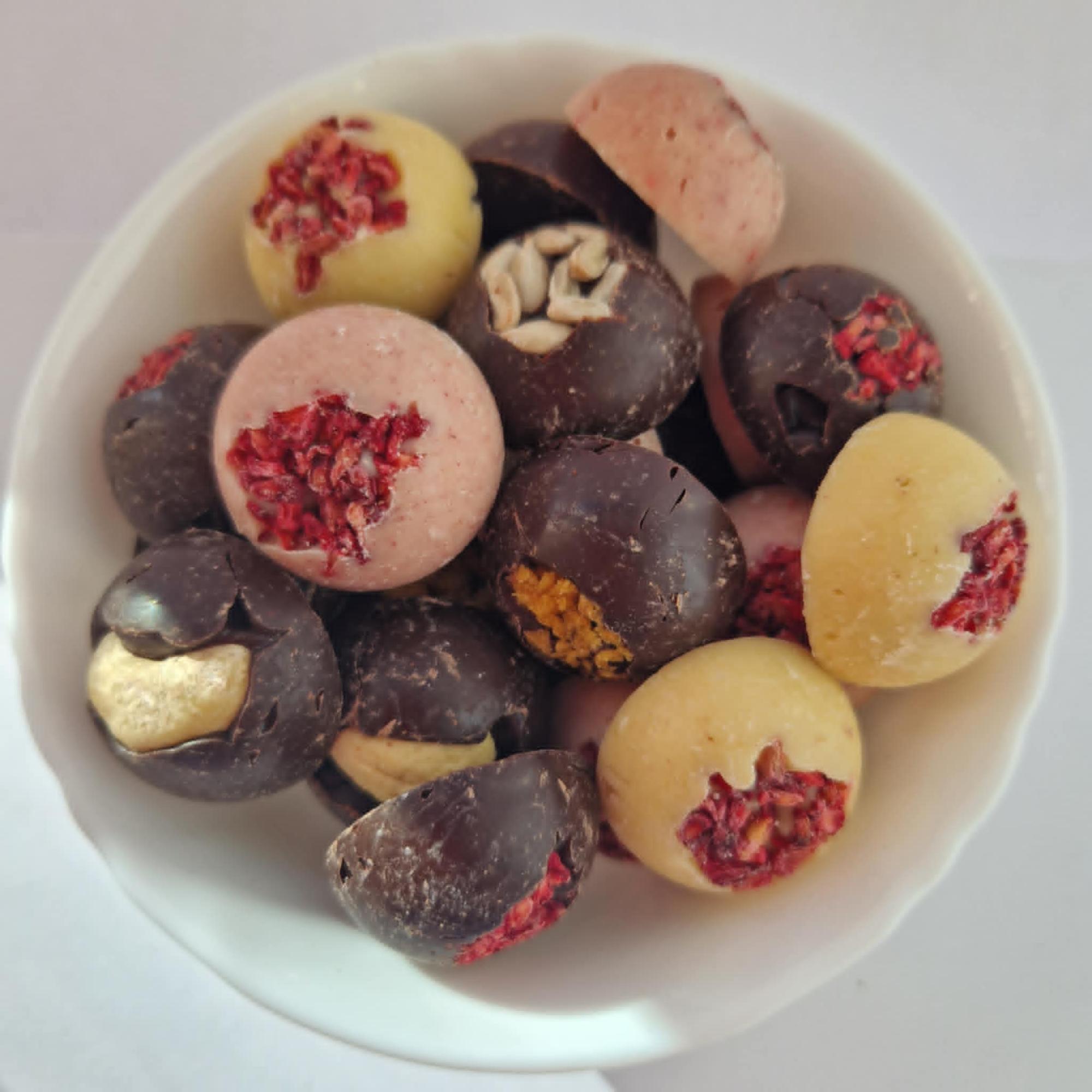 Összetevők: vegán csokoládé(cukor, kakaóvaj, kakaómassza, tigrismogyoró por,rezisztens dextrin, emulgeálószer: napraforgó lecitin, természetes vanília), napraforgó, tökmag, liof,málna, liof.narancs.